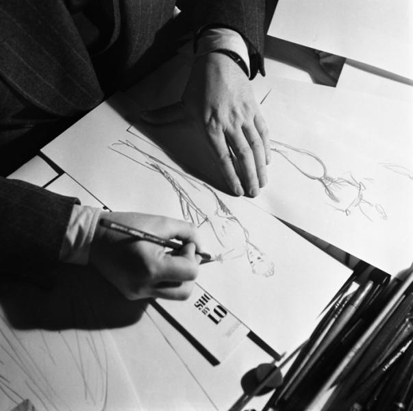 • Christian Dior dessine chez lui, 10 rue Royale, Paris, 1947